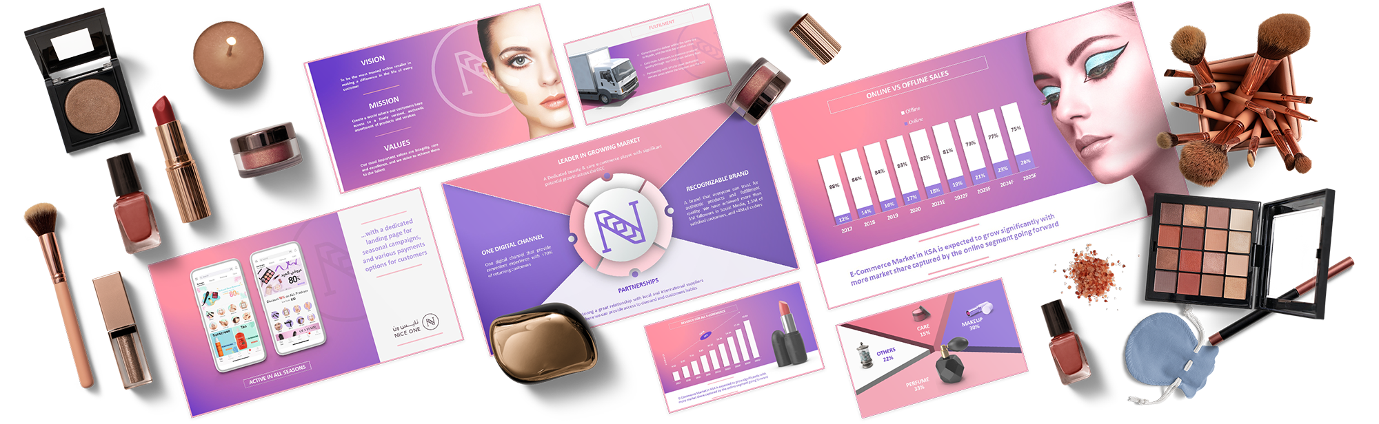 A custom investor presentation designed for Nice One, Saudi Arabia’s leading beauty reseller, to support brand communication and growth discussions with potential investors.